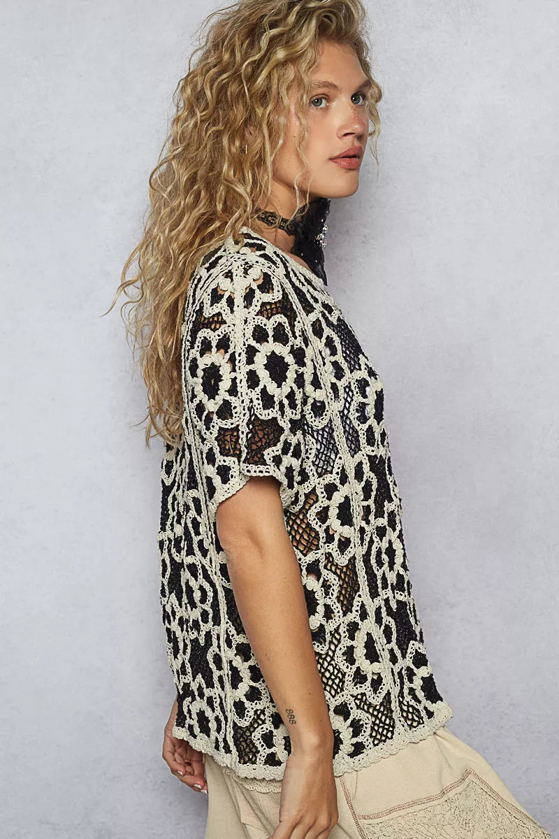 POL Openwork Short Sleeve Crochet Knit Top with Weave Knit Patterns