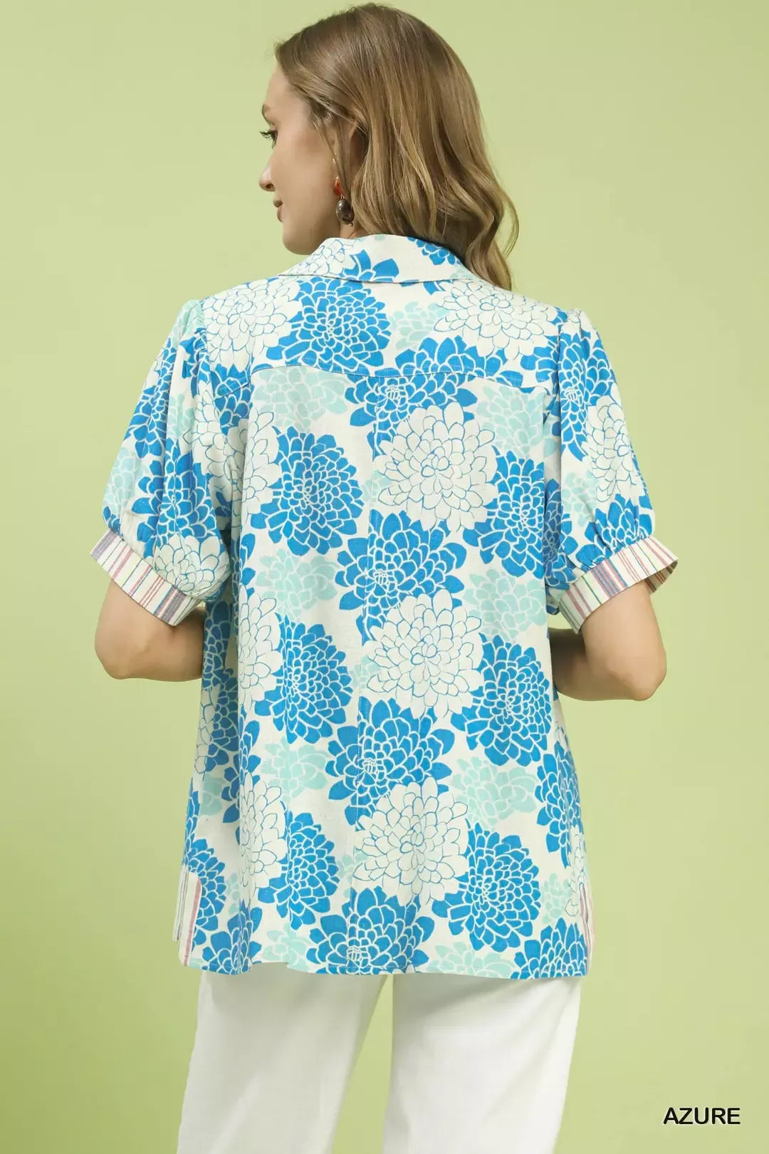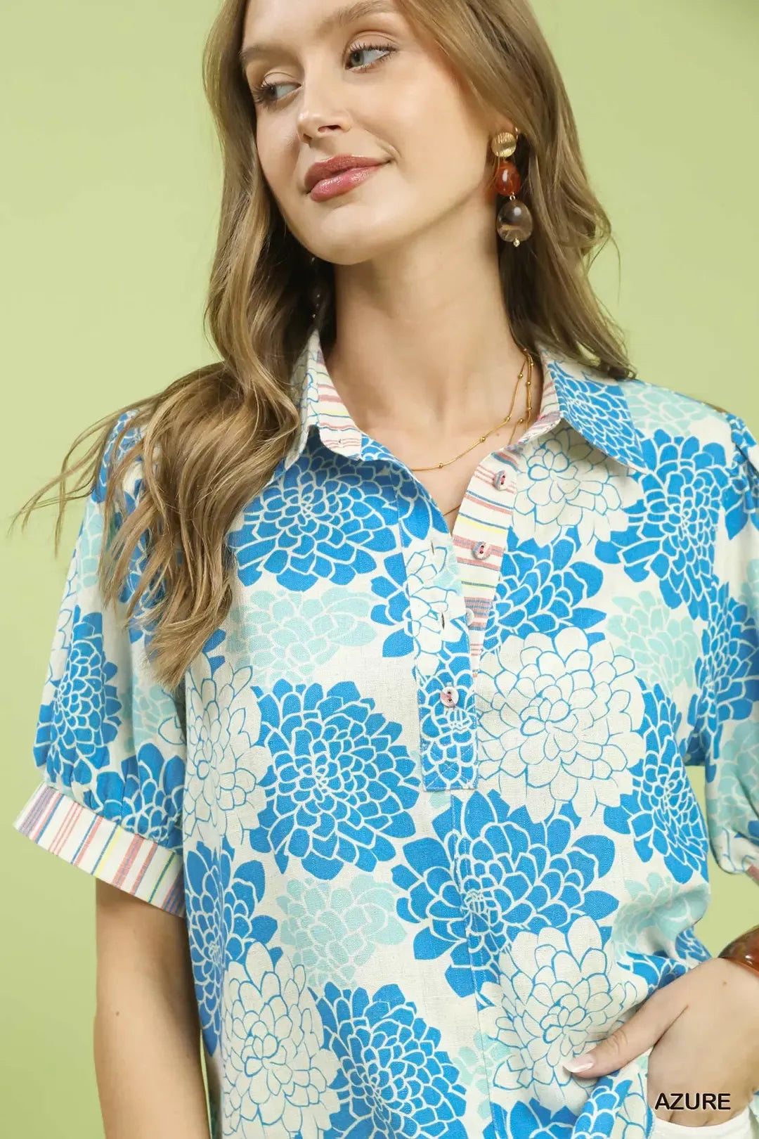 Umgee Aqua Floral Collared Short Sleeve Blouse