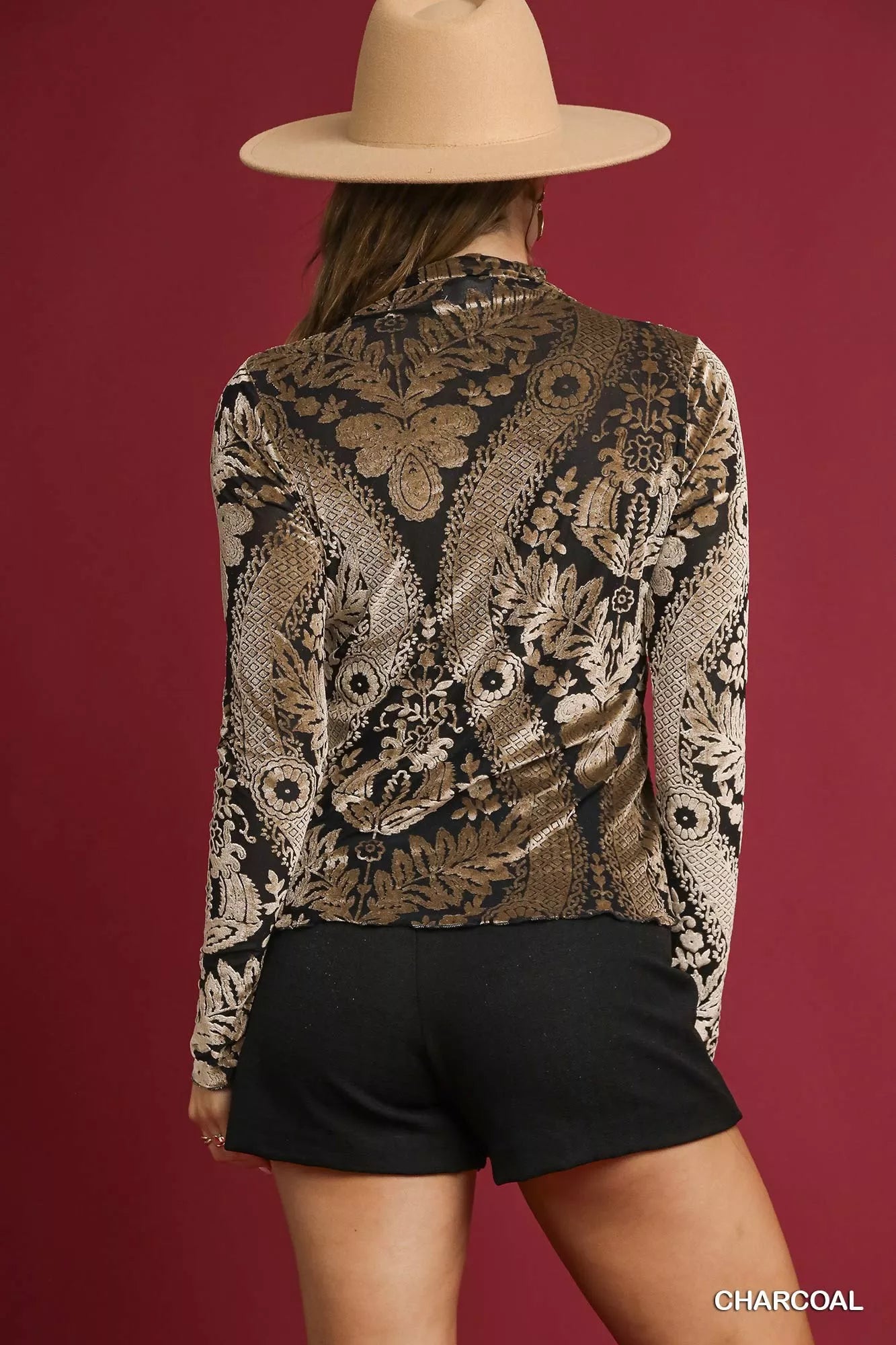 The damask print velvet burnout top is a luxurious and elegant piece that exudes sophistication and style. The damask print adds a touch of vintage charm and intricate detail to the top. The velvet burnout fabric creates a rich and textured look, perfect for a statement ensemble. This top is ideal for special occasions or evening events where you want to make a chic and memorable impression. Pair it with tailored pants or a skirt for a refined and polished outfit that will turn heads and showcase your impeccable taste.